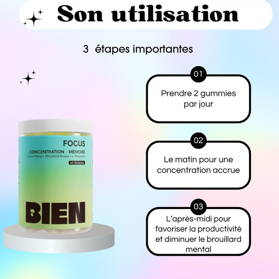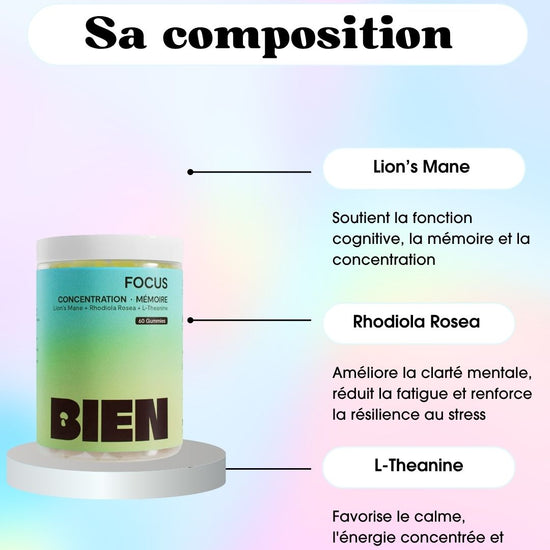 FOCUS est le nouveau meilleur ami de votre cerveau – un puissant mélange de lion's mane, de rhodiola rosea et de L-théanine conçu pour aiguiser la concentration, améliorer la clarté mentale et éloigner les distractions.