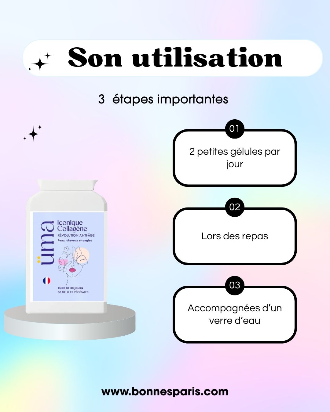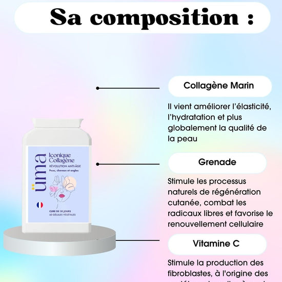 Collagène marin type 1 (Peptan F2000ld), Enveloppe de la capsule : Hydroxypropyl méthylcellulose (HPMC), Acide ascorbique, Farine de riz brun (Oryza Sativa), Poudre d'acide hyaluronique (1M Dalton) (Hyaluronate de Sodium), Citrate de zinc, Vitamine B3 (Nicotinamide), Extrait de riz (Oryza Sativa), Vitamine E (D-alpha Tocopherol), Selenomethionine (Phosphate de Calcium), Poudre d’astaxanthine (Haematococcus Pluvialis), Poudre de silice de bambou (Bambusa Vulgaris), Extrait de graine de grenade (Punica Granatum), Extrait d'écorce de pin (Pinus Massoniana), Extrait de pepins de pamplemousse (citrus Paradisi), Glycinate de cuivre, Extrait de feuille de romarin (Rosmarinus Officinalis), Vitamine B8 (Biotine)