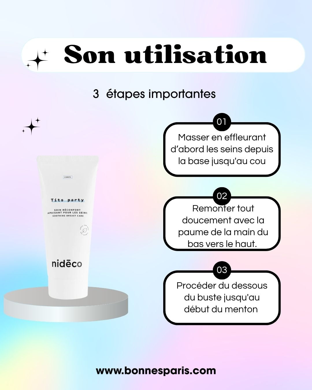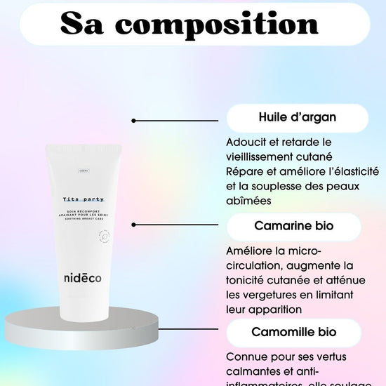 Son action globale couvrant tous les besoins de la peau fragilisée des seins, de l'apaisement à la tonicité sans oublier la réparation des tétons.